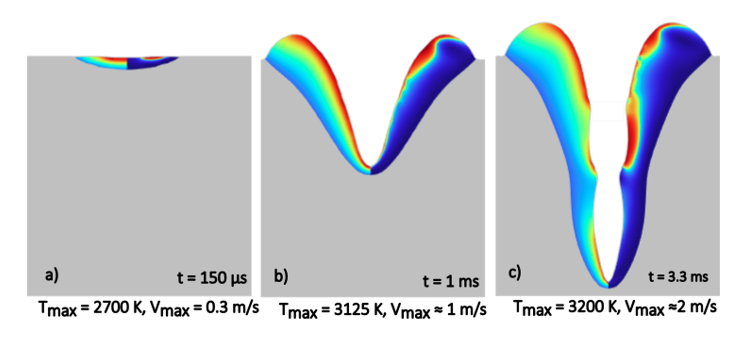 A figure from the award-winning paper titled “Numerical and Experimental Study of Melt Instabilities During Spot Laser Welding of Aluminium”, depicting the temperature and velocity evolution in a melt pool.